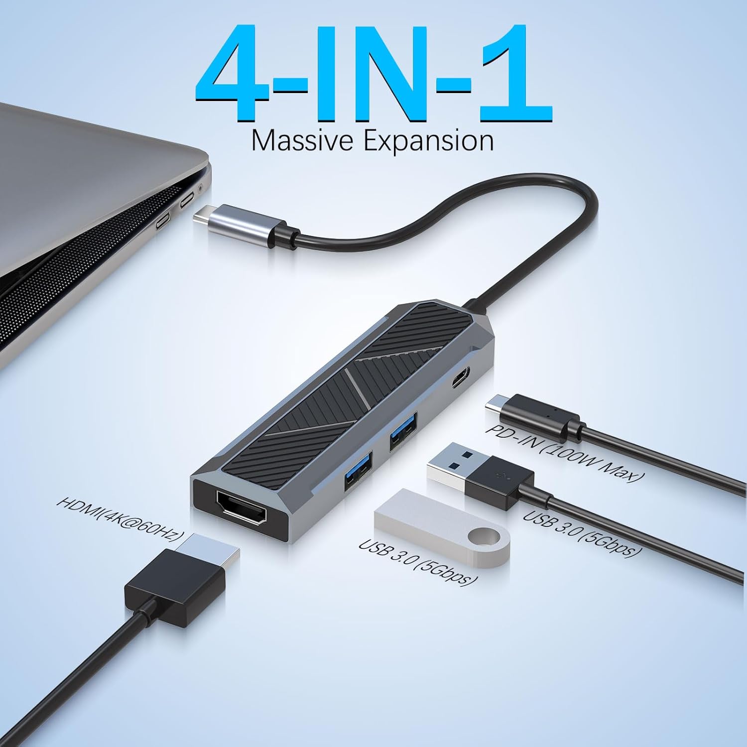 Rozbočovač USB-C 4 v 1 s rozbočovačem HDMI 4K 60Hz je multifunkční rozšiřující zařízení, které se připojuje k notebooku, tabletu nebo kompatibilnímu zařízení prostřednictvím rozhraní USB-C. Převádí jeden port USB-C na čtyři základní možnosti připojení, obvykle včetně výstupu displeje HDMI a více datových portů USB.
