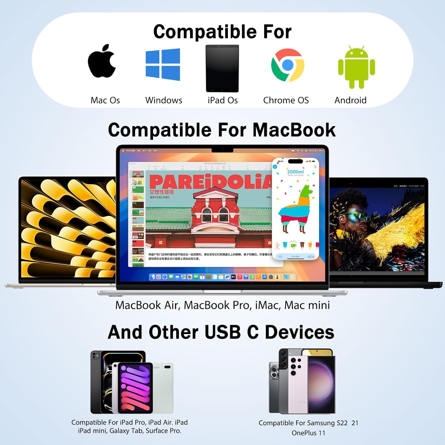 Rozbočovač USB-C 4 v 1 s rozbočovačem HDMI 4K 60Hz je kompatibilní s mnoha moderními zařízeními vybavenými porty USB-C, které podporují výstup videa.