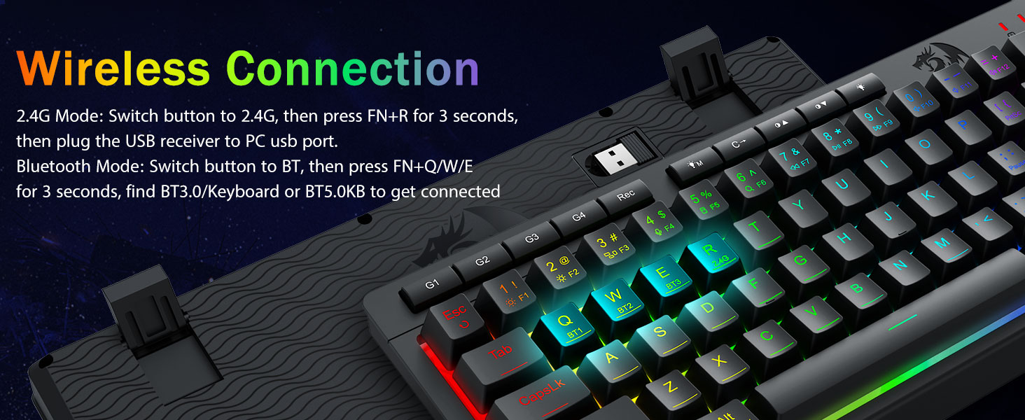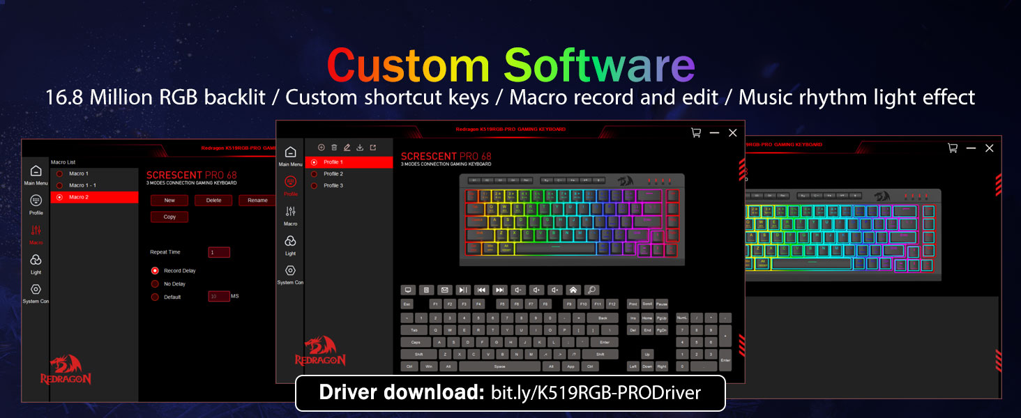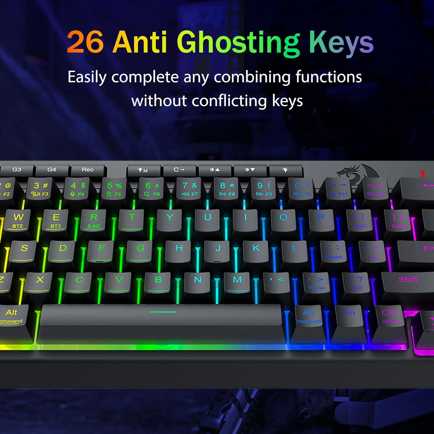 Černá přenosná bezdrátová herní klávesnice K519 Pro od Redragon, vyrobená společností Chuangquan, je příkladem profesionálního inženýrství pro hráče i profesionály. Jeho všestranný design ve třech režimech podporuje stabilní Bluetooth, bezdrátové připojení 2,4 GHz s nízkou latencí a kabelové připojení USB-C, což umožňuje snadné přepínání mezi třemi zařízeními současně. Klávesnice obsahuje speciální makro klávesy, které lze plně přizpůsobit pomocí intuitivního softwaru a umožňují uživatelům přiřazovat složité příkazy nebo zkratky pro zvýšení produktivity a efektivity hraní. Dynamické RGB osvětlení s více efekty přizpůsobí nastavení, zatímco N-key rollover a anti-ghosting zajistí, že každý stisk klávesy bude během intenzivních relací přesně registrován.