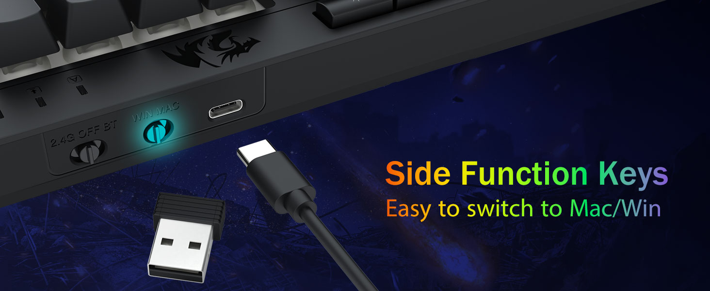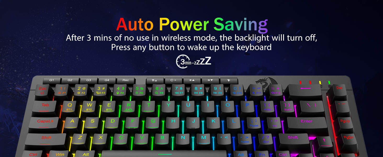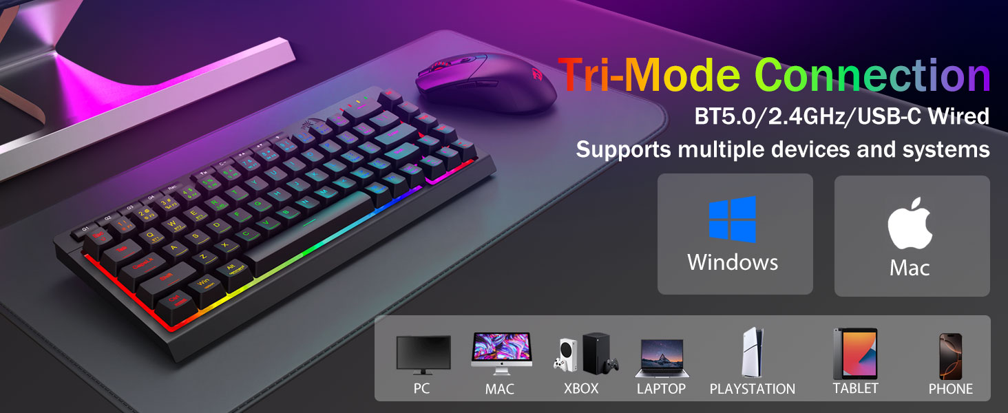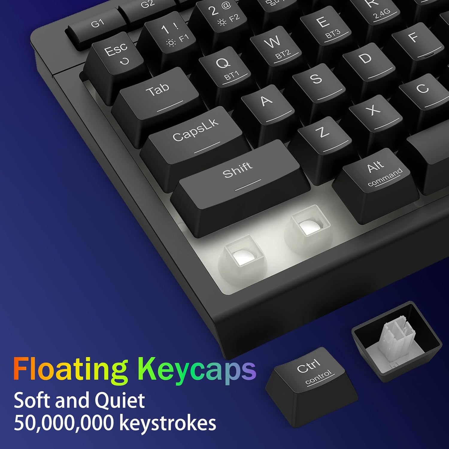 Všestrannost ve třech režimech a ovládání více zařízení -Plynule přepínejte mezi režimy Bluetooth 5.0, 2,4 GHz bezdrátově nebo kabelem USB-C a připojujte až 5 zařízení současně (PC, Mac, tablety, telefony, PS/XBOX). Snadno přepínejte zařízení pomocí klávesových zkratek nebo bočního tlačítka – ideální pro hybridní pracovní/herní nastavení. Zůstaňte napájeni týdny s baterií 4 000 mAh (30+ dní v pohotovostním režimu, 50 hodin RGB běhu).