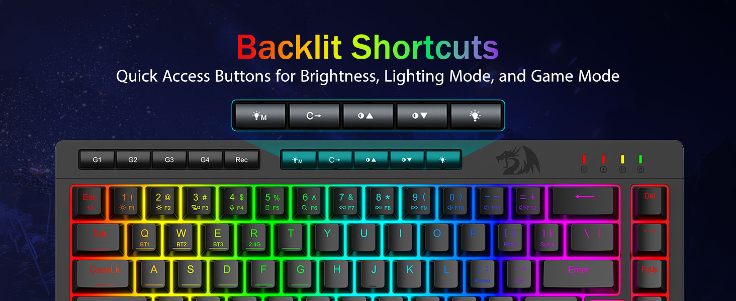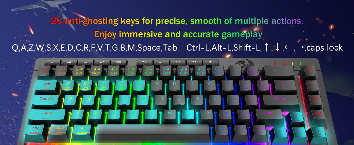 Profesionální herní výkon a speciální podsvícené ovládací prvky –Obsahuje anti-ghosting klávesy (klávesy s podtržením), které umožňují 26 klávesám pracovat současně pro rychlé a přesné odezvy hry tak, jak jste zamýšleli. Tlačítka rychlého přístupu pro jas, režim osvětlení a herní režim pro rychlé nastavení jasu, světelných profilů a aktivaci herního režimu pouhým stisknutím tlačítka.