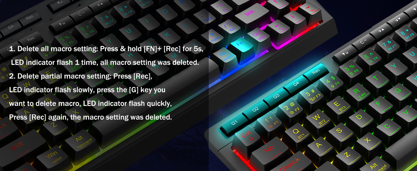 Přizpůsobitelná makra, ovládání bez námahy –Okamžitě naprogramujte 4 integrované makro klávesy (G1-G4) – není potřeba žádný software. Nahrávejte složitá komba pro hraní her, zkratky pro produktivitu nebo mediální příkazy. Předefinujte svůj pracovní postup během několika sekund. Můžete také použít software k přizpůsobení funkcí, vytváření maker, úpravě RGB světel a nastavení zkratek. Odkaz na software: bit.ly/K524RGB-PRODriver