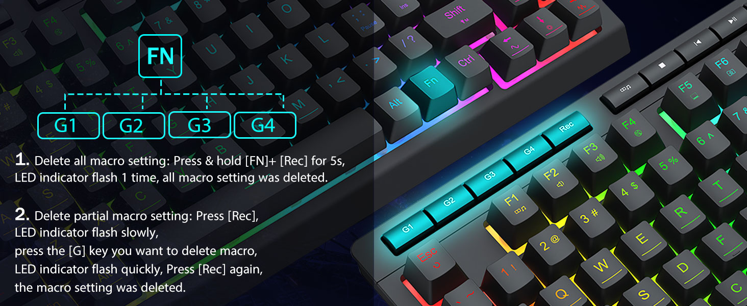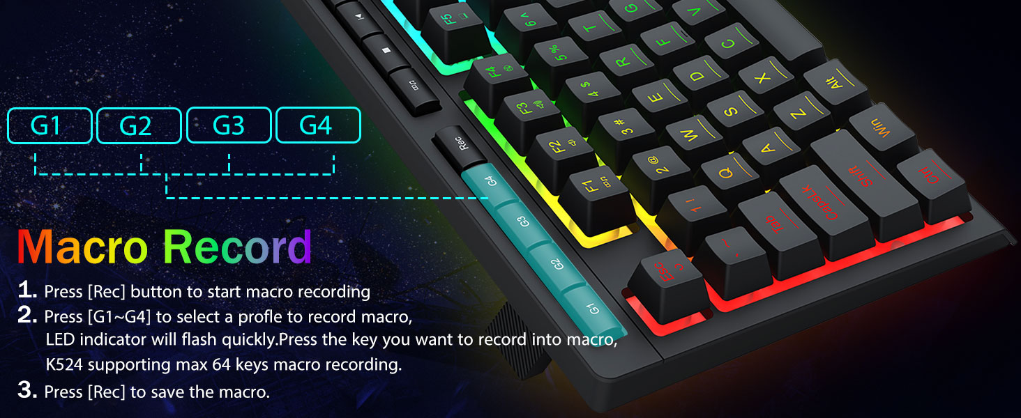 4 integrované makro klávesy -4 integrované makro klávesy (G1~G4) jsou programovatelné a fungují za běhu bez dalšího softwaru. Klávesy se snadno upravují a mohou provádět řadu různých maker.