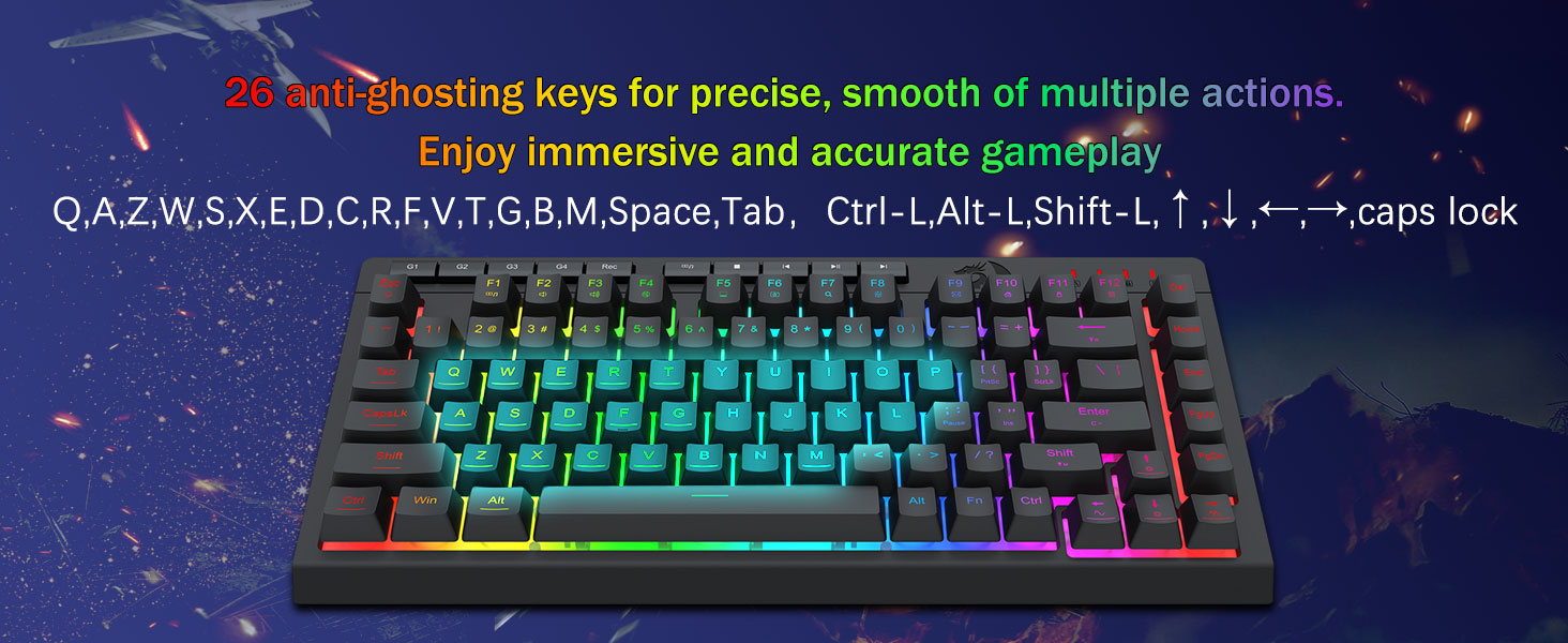 26 kláves Anti-ghost a ovládání vyhrazených médií -Obsahuje anti-ghosting klávesy (klávesy s podtržením), které umožňují 26 klávesám pracovat současně pro rychlé a přesné odezvy hry tak, jak jste zamýšleli. Speciální ovládací prvky médií vám umožňují přehrávat, pozastavovat a přeskakovat multimédia přímo z klávesnice, takže vaše hraní je plynulé a nepřerušované.