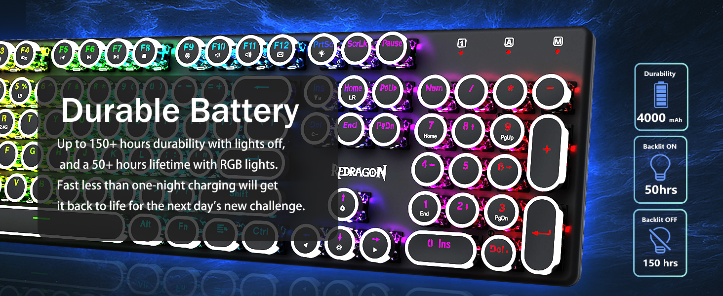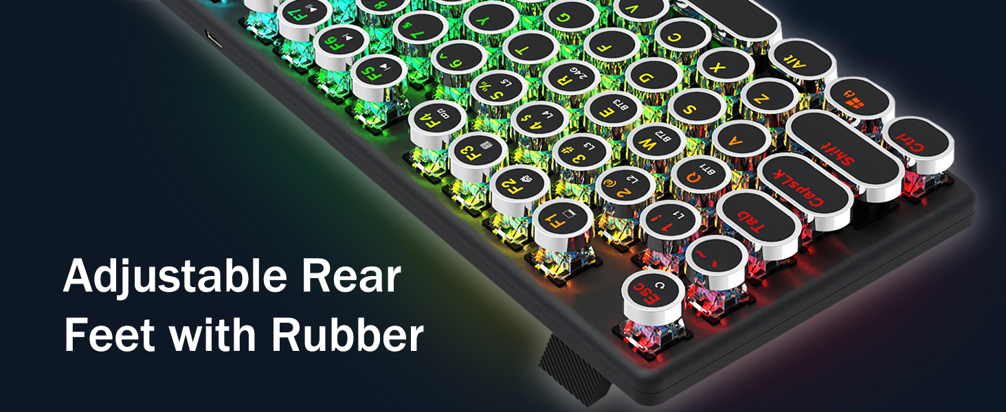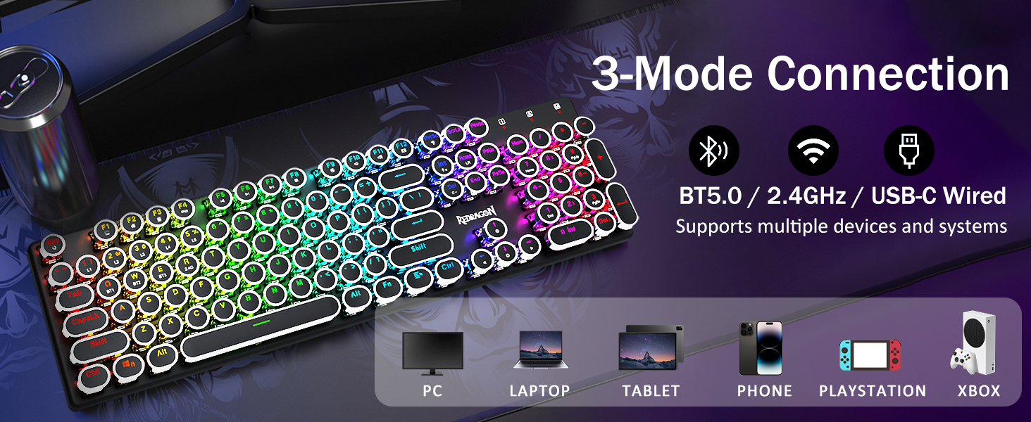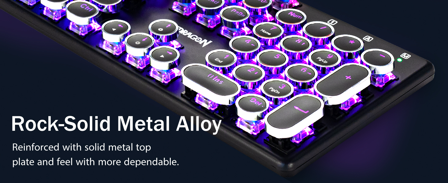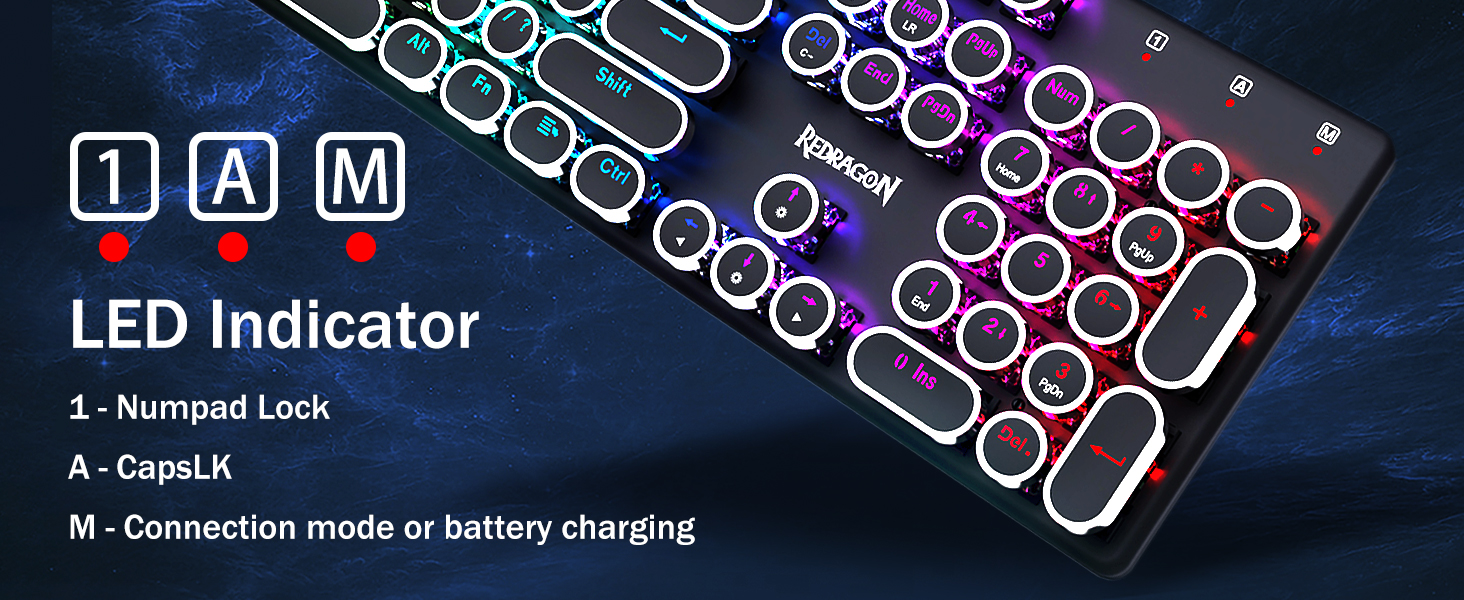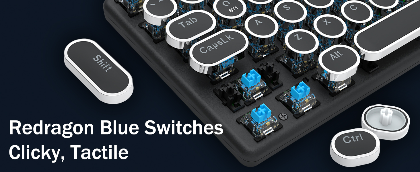 𝗥𝗲𝘁𝗿𝗼 𝗧𝘆𝗽𝗲𝘄𝗿𝗶𝘁𝗲𝗿 𝗦𝘁𝘆𝗹𝗲 𝘄𝗶𝘁𝗶𝘁𝗶𝘁𝗶 𝗠𝗲𝗰𝗵𝗮𝗻𝗶𝗰𝗮𝗹 𝗞𝗲𝘆𝘀 -Modré spínače Redragon Mechanical nabízejí střední odolnost, slyšitelný cvakavý zvuk a hmatovou zpětnou vazbu, poskytují citlivé a přesné herní prostředí a výkon. Vintage steampunková klávesnice s kulatými klávesami vypadá jako klasický psací stroj, přináší vám pohodlný pocit při psaní a stabilní klikání.