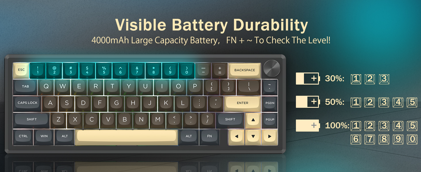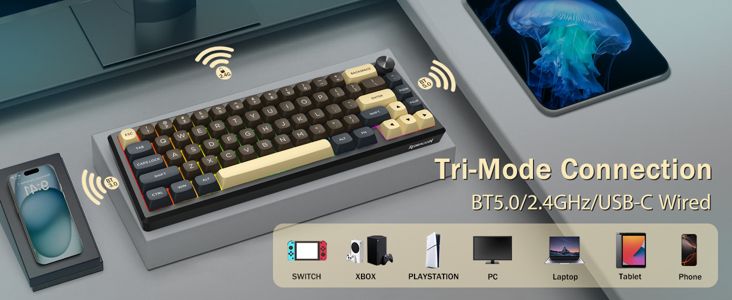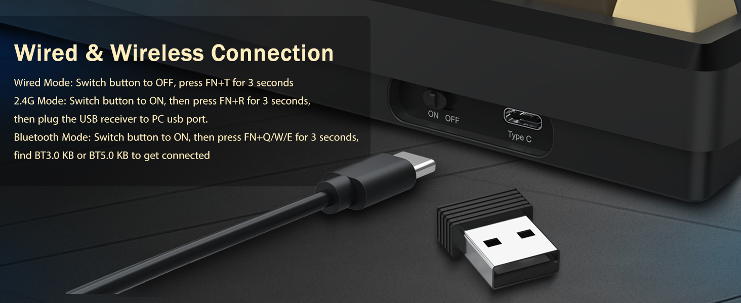 Klávesnice podporuje bezdrátové připojení pro pohodlí a kabelové připojení USB pro stabilní výkon. Uživatelé mohou přepínat mezi režimy v závislosti na jejich nastavení.