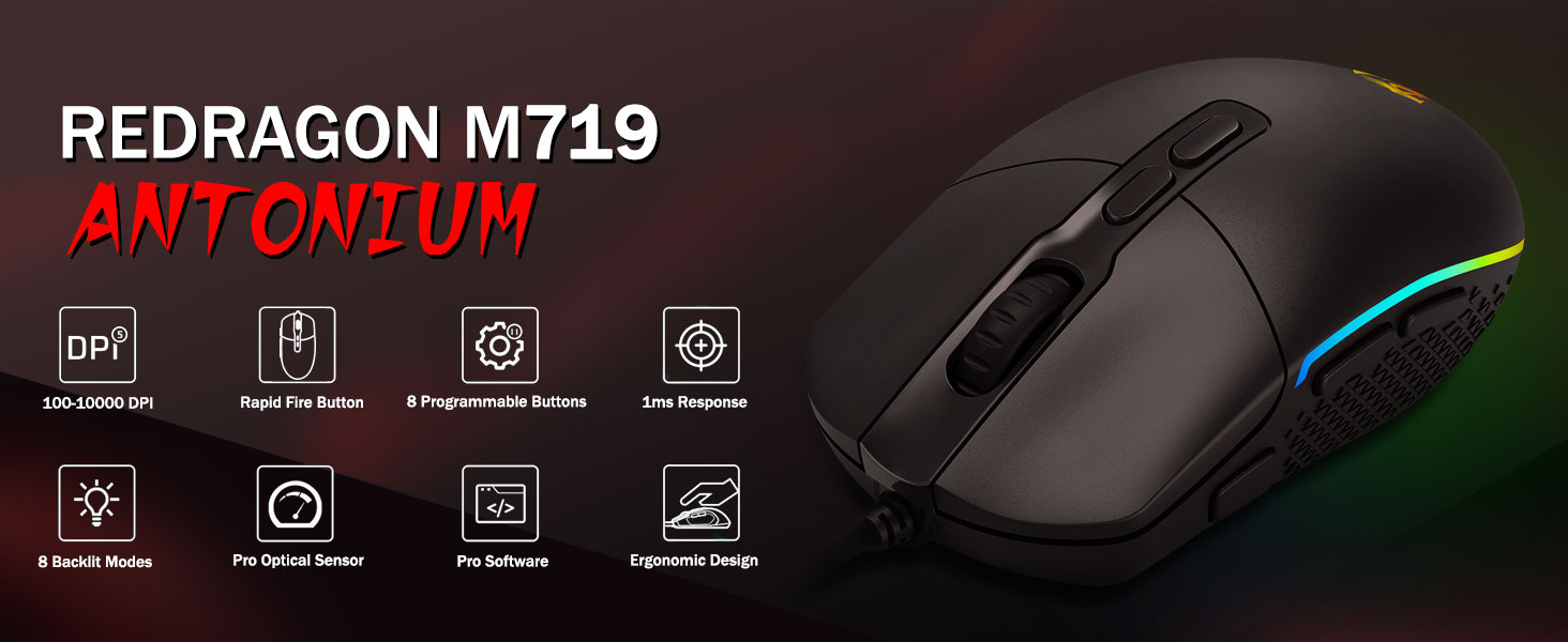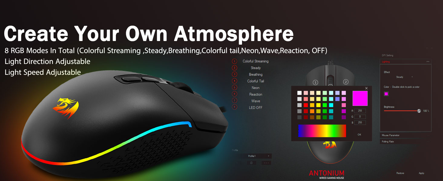 8 slušných režimů podsvícení RGB- Zapněte podsvícení a zabijte na svém herním bojišti. Hypedovaná dynamická RGB podsvícená atmosféra vás nikdy nezklame při zdobení vašeho herního prostoru, bylo by to lepší s jiným příslušenstvím Redragon se zapnutými světly.