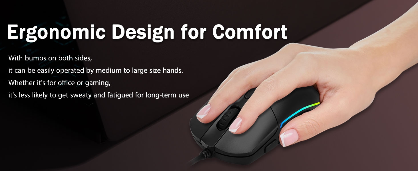 Pohodlná rukojeť- Ergonomické výstupky na obou stranách dělají herní myši vhodné do každé ruky. Poskytuje hráčům dlouhotrvající pohodlí bez únavy i během dlouhých hodin intenzivního hraní. Neklouže při zvedání herní myši ani při rychlých a přesných tahech.