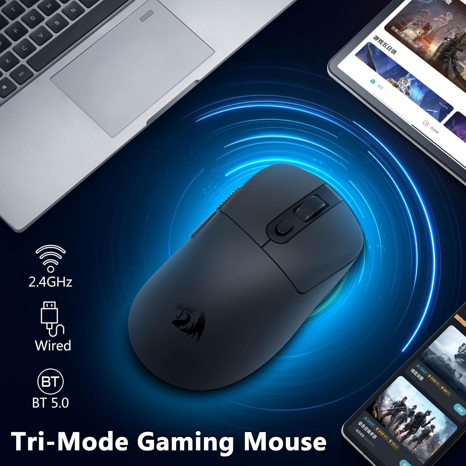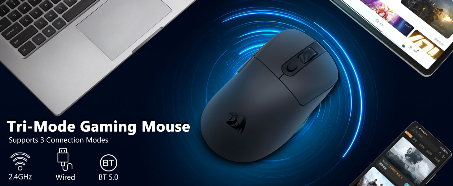 CHUANGQUAN Black M818 Wireless 24 000 DPI, třírežimová 2,4G herní myš poskytuje přesné sledování, flexibilní připojení a plynulé ovládání, ideální pro hráče a profesionály, kteří hledají rychlost, přesnost a bezproblémový výkon na více zařízeních.