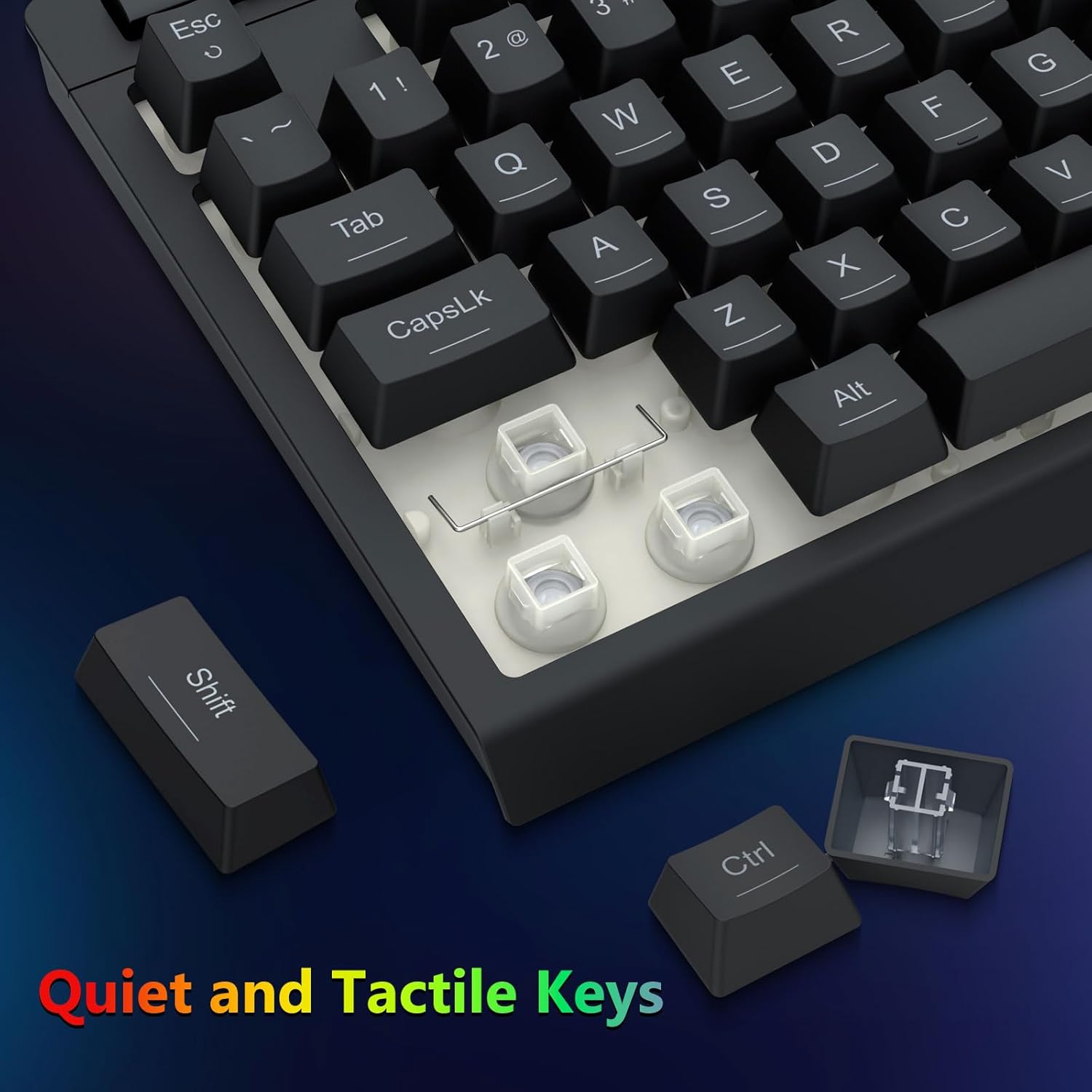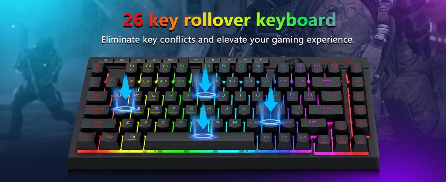 【Pohodlné hraní】Skládací stojan klávesnice, povrchová úprava šetrná k pokožce a plovoucí krytky kláves zvyšují pohodlí při psaní. 26 kláves Anti-ghosting zajišťuje, že lze spustit každé tlačítko. Klávesu WIN lze pro hraní her deaktivovat. Tato klávesnice a myš jsou určeny k poskytování efektivního herního zážitku při zajištění maximálního pohodlí