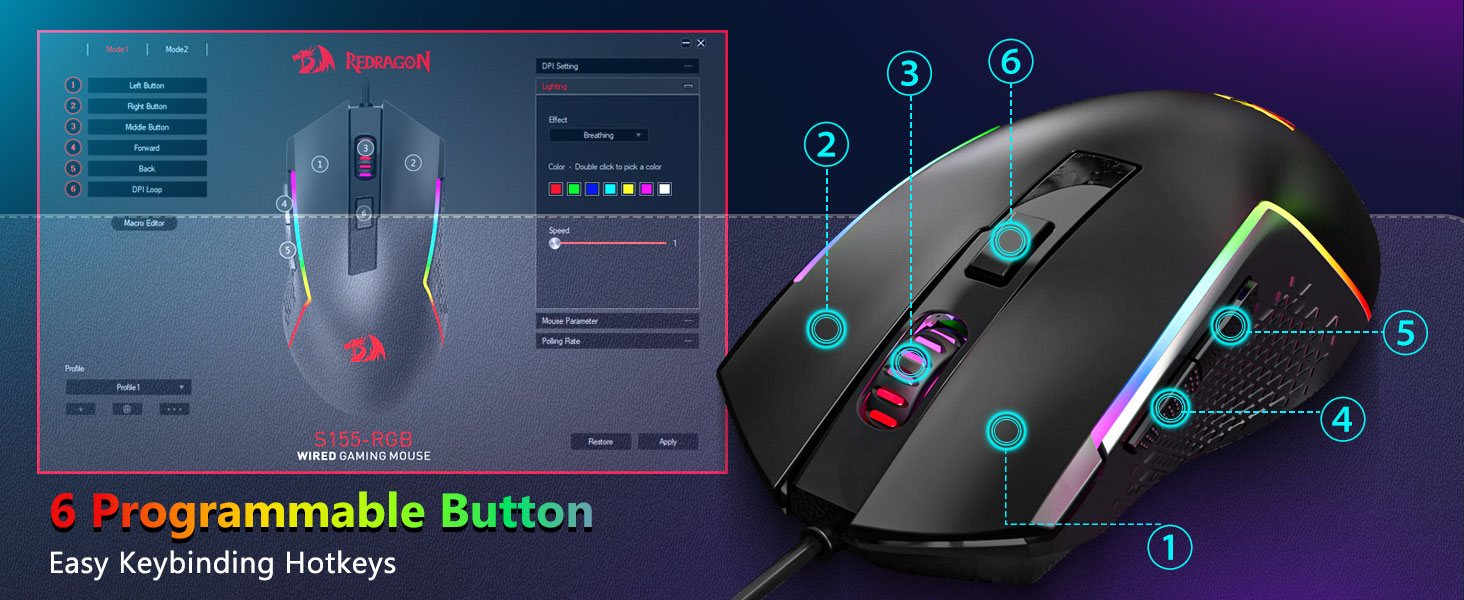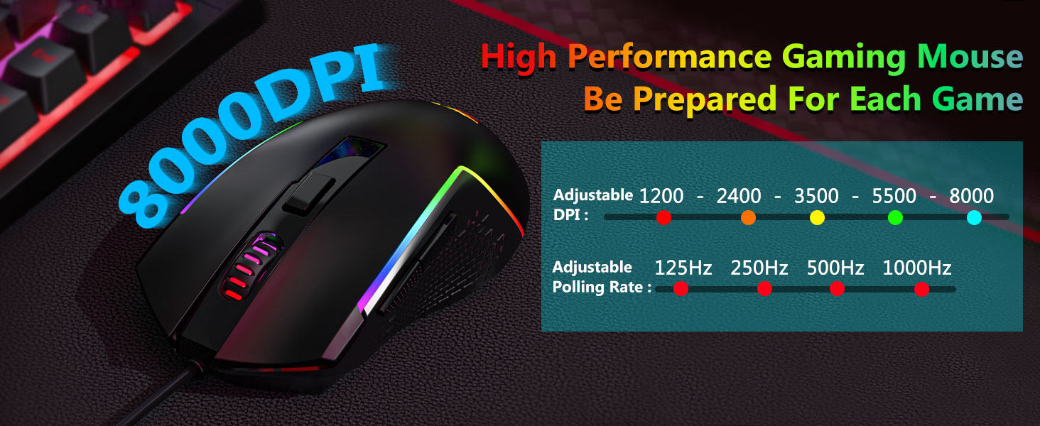 【Profesionální herní myš】Můžete nastavit DPI od 1200 do 8000 pomocí tlačítka DPI nebo od 100 do 8000 pomocí softwarového ovladače, abyste snadno splnili své různé potřeby při hraní nebo práci. Celkem 7 tlačítek, z nichž 6 je programovatelných. High-Precision Sensor poskytuje přesnou přesnost, zatímco herní mikrospínače zajišťují dlouhou životnost, větší odolnost a extrémní odezvu, což vám dává ještě větší náskok před konkurencí. (Software také podporuje nastavení rychlosti dotazování myši až do 1000 Hz)