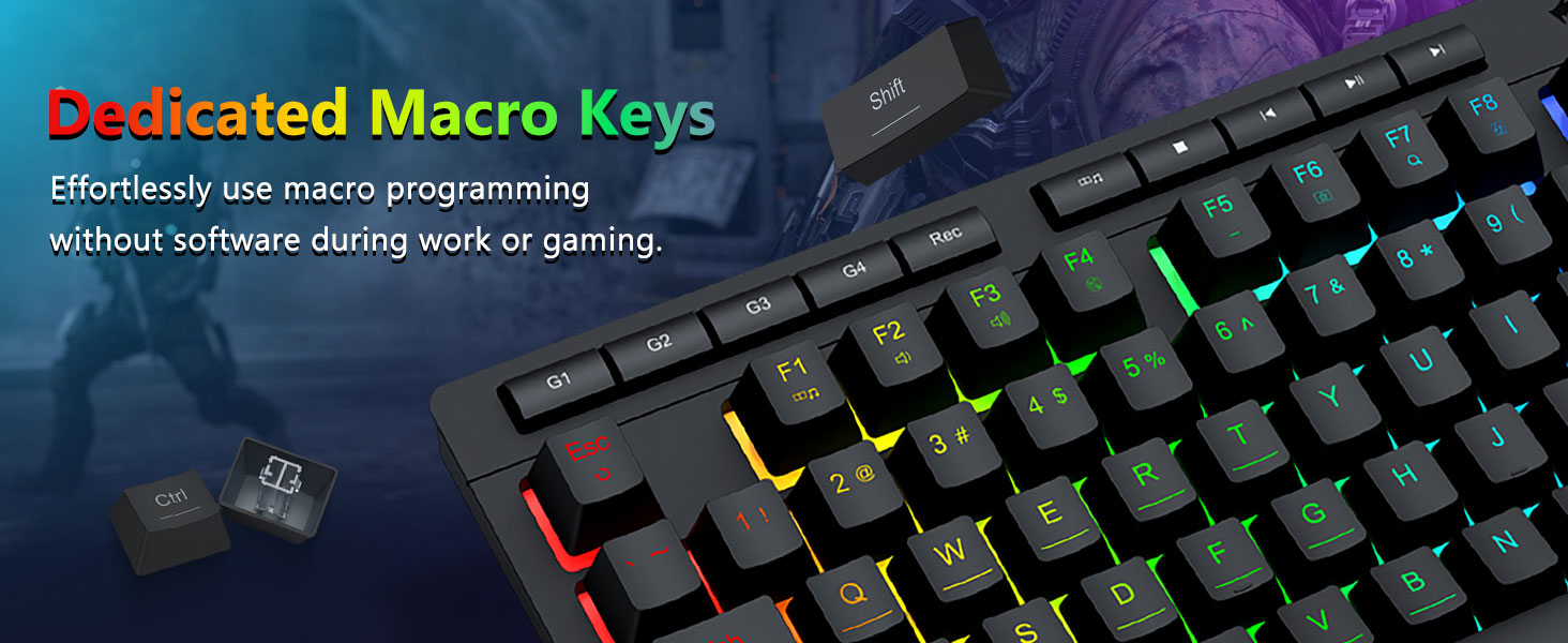 【Efektivní a pohodlné】Tato herní kombinace klávesnice a myši je vybavena 4 zabudovanými makro klávesami, 5 nezávislými multimediálními klávesami a 12 multimediálními funkčními klávesami FN, které jsou jednoduché a pohodlné na ovládání. Nejen, že zvyšuje efektivitu, ale také činí váš herní proces pohodlnějším a rychlejším
